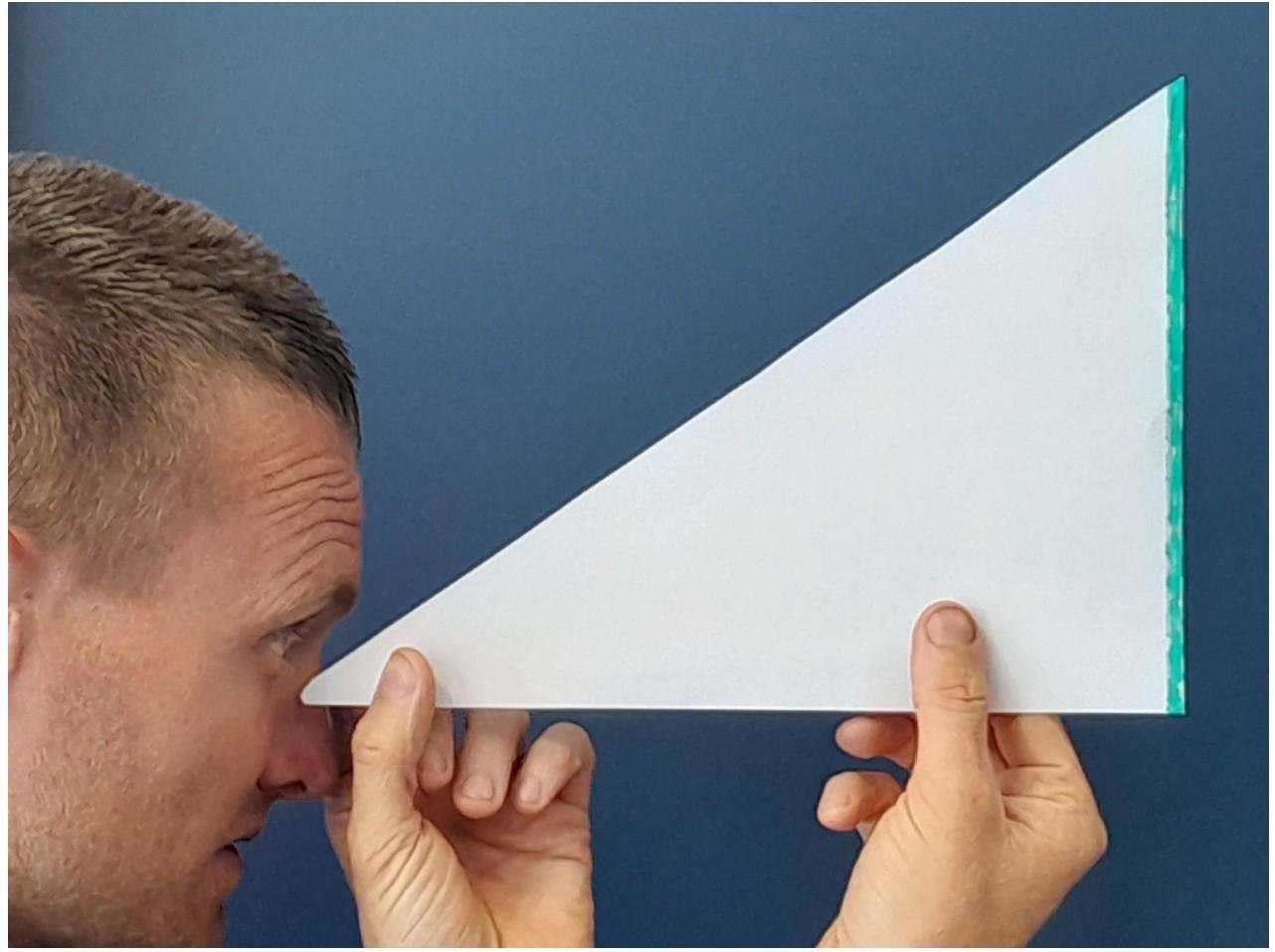 • Nous avons utilisé un triangle rectangle afin de mesurer la hauteur de l’arbre. Maëlys s’est positionnée en observatrice avec une équerre près des yeux de sorte que le côté du triangle rectangle qui est opposé à l’œil de Maëlys soit parallèle à l’arbre.