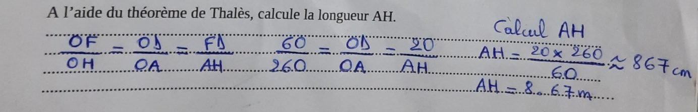 D’où AH = (20 x 260)/60 = 867 cm.
