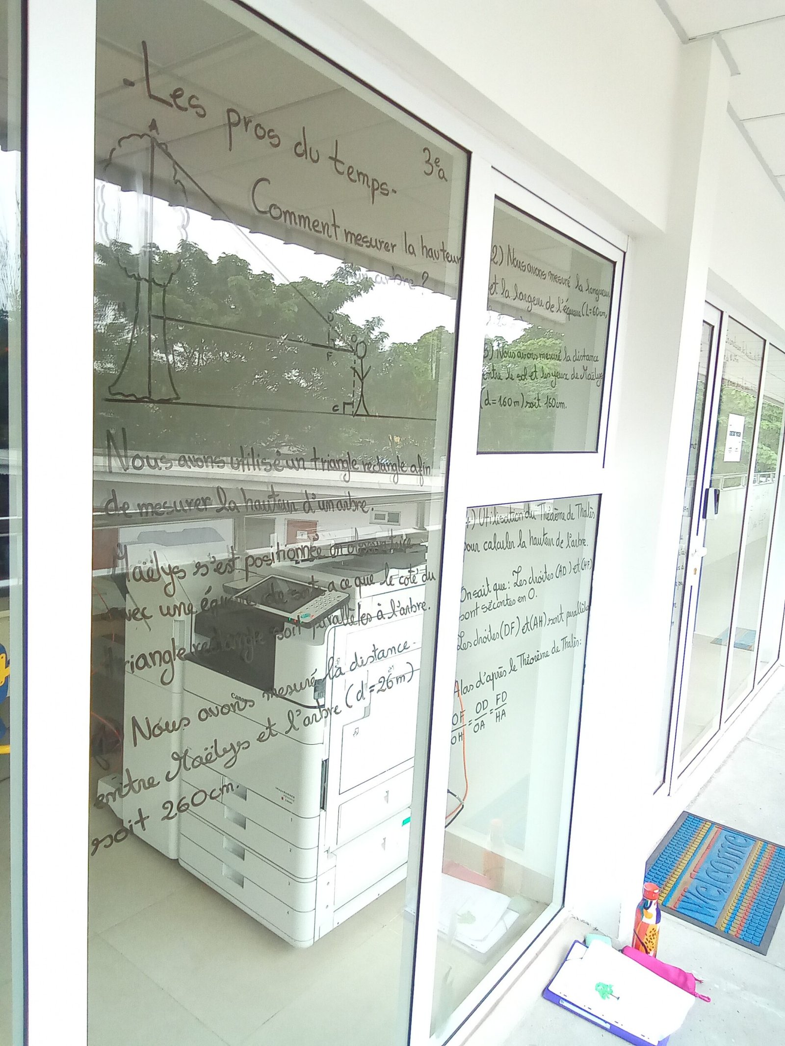 Une fois tous ces calculs faits, nous prîmes un autre cours de maths dédié à la semaine des maths. Durant celui-ci, chaque groupe s’éparpilla dans les quatre coins de l’école afin de décorer l’école de nos calculs. Nous avons écrit sur les surfaces en verre comme les portes et les fenêtres avec pour but de mettre à la vue de tous comment les maths peuvent être utilisées dans des situations du quotidien. Nous avons alors décrit tous nos calculs et illustré ceux-ci pour une meilleure compréhension.